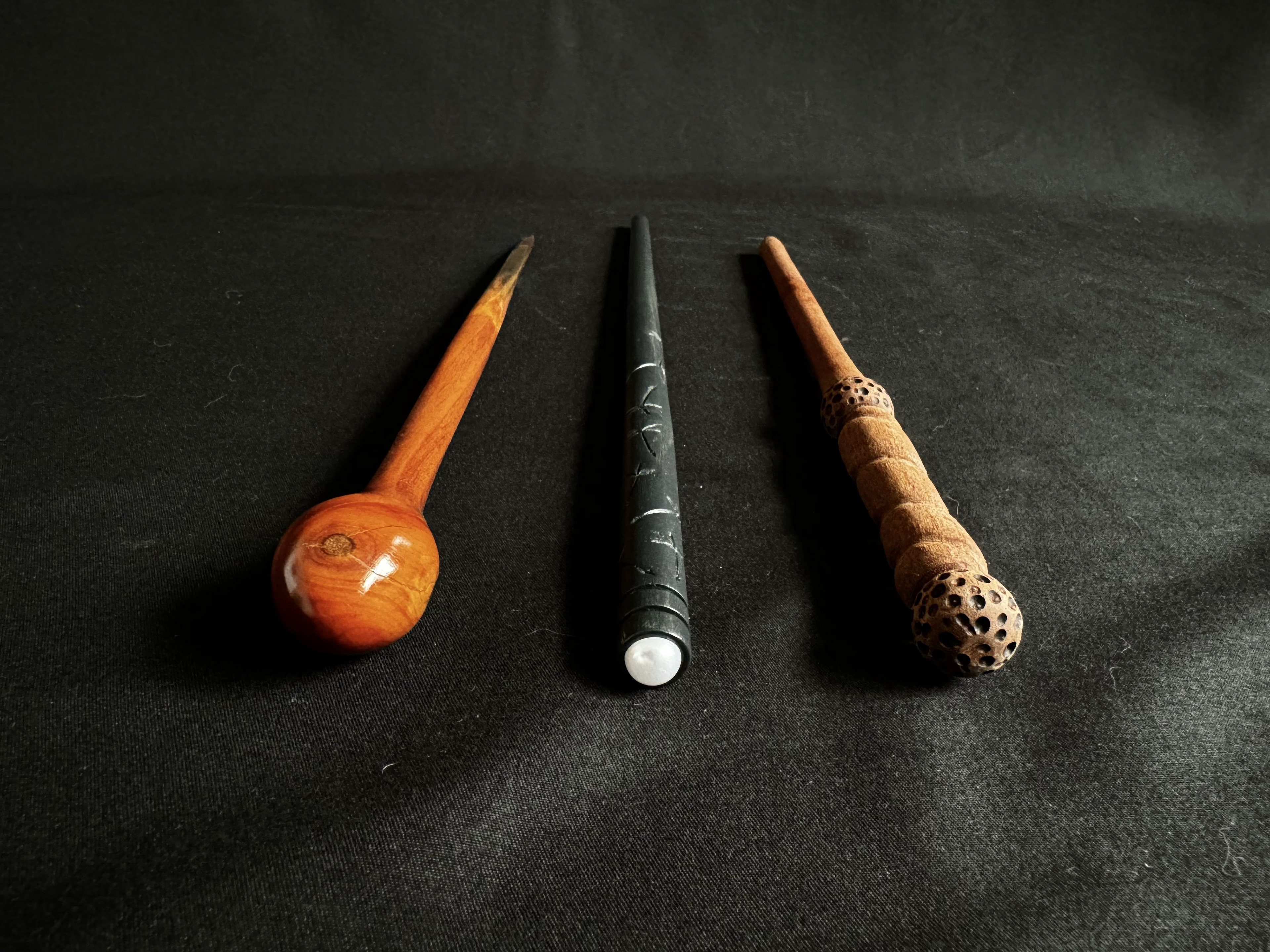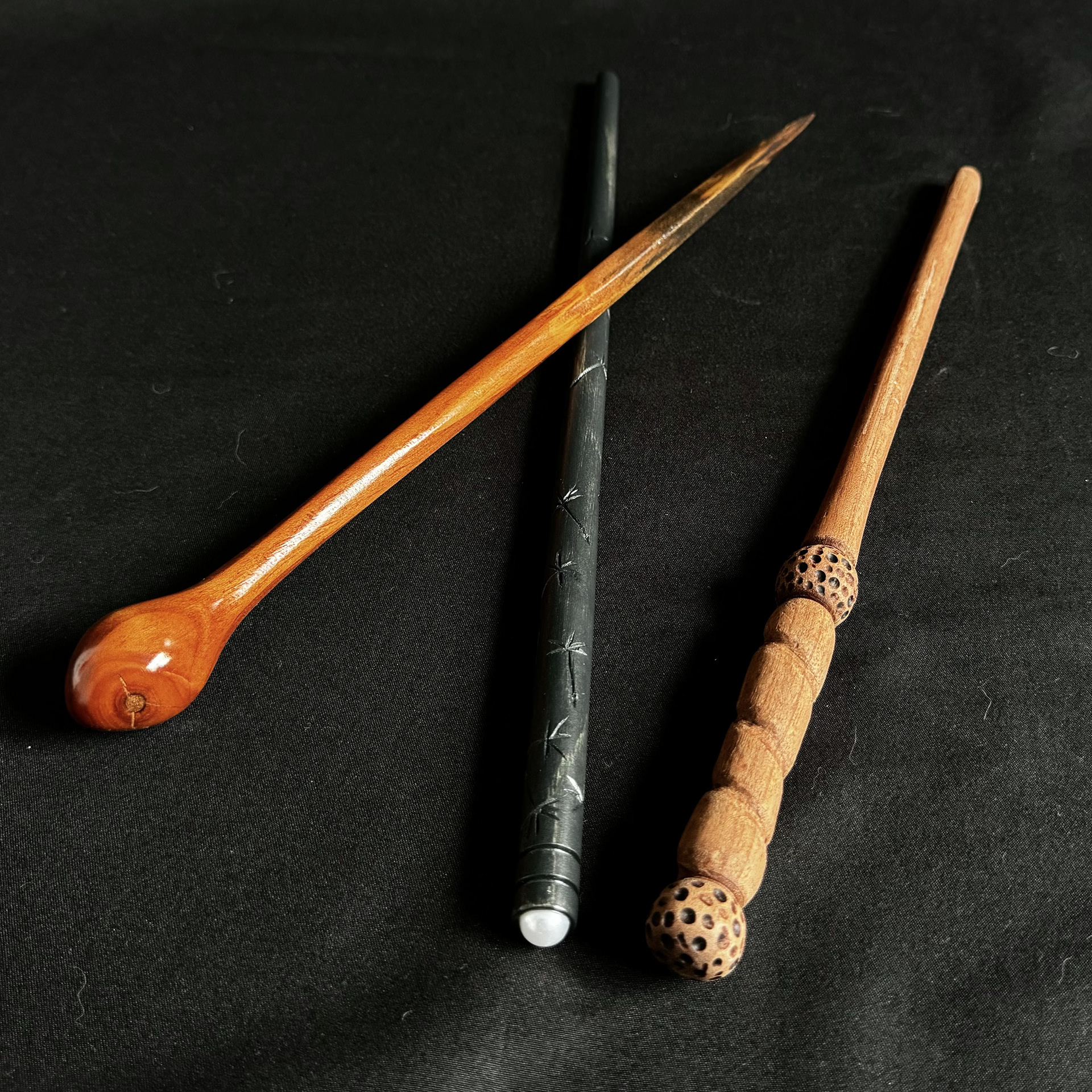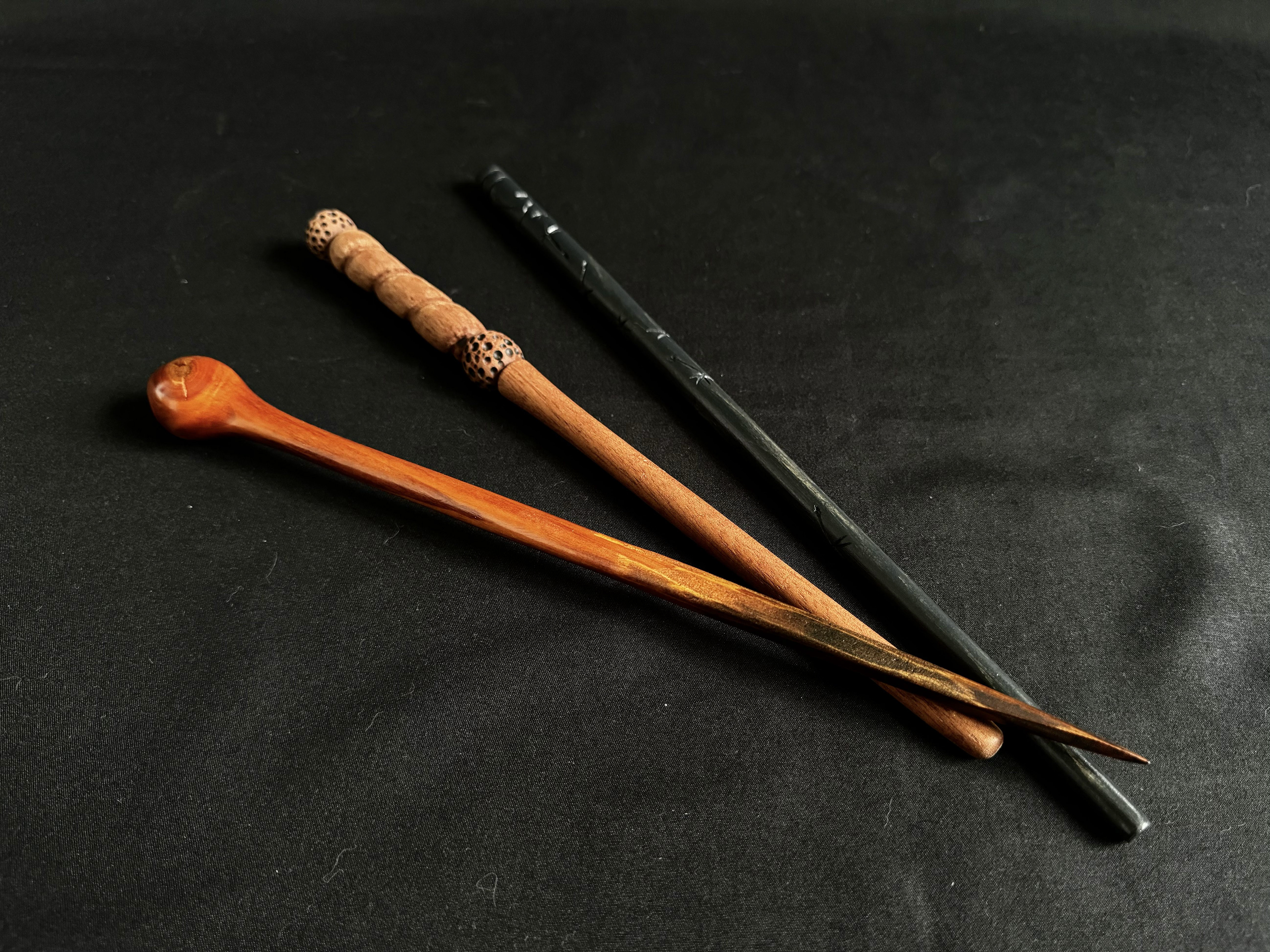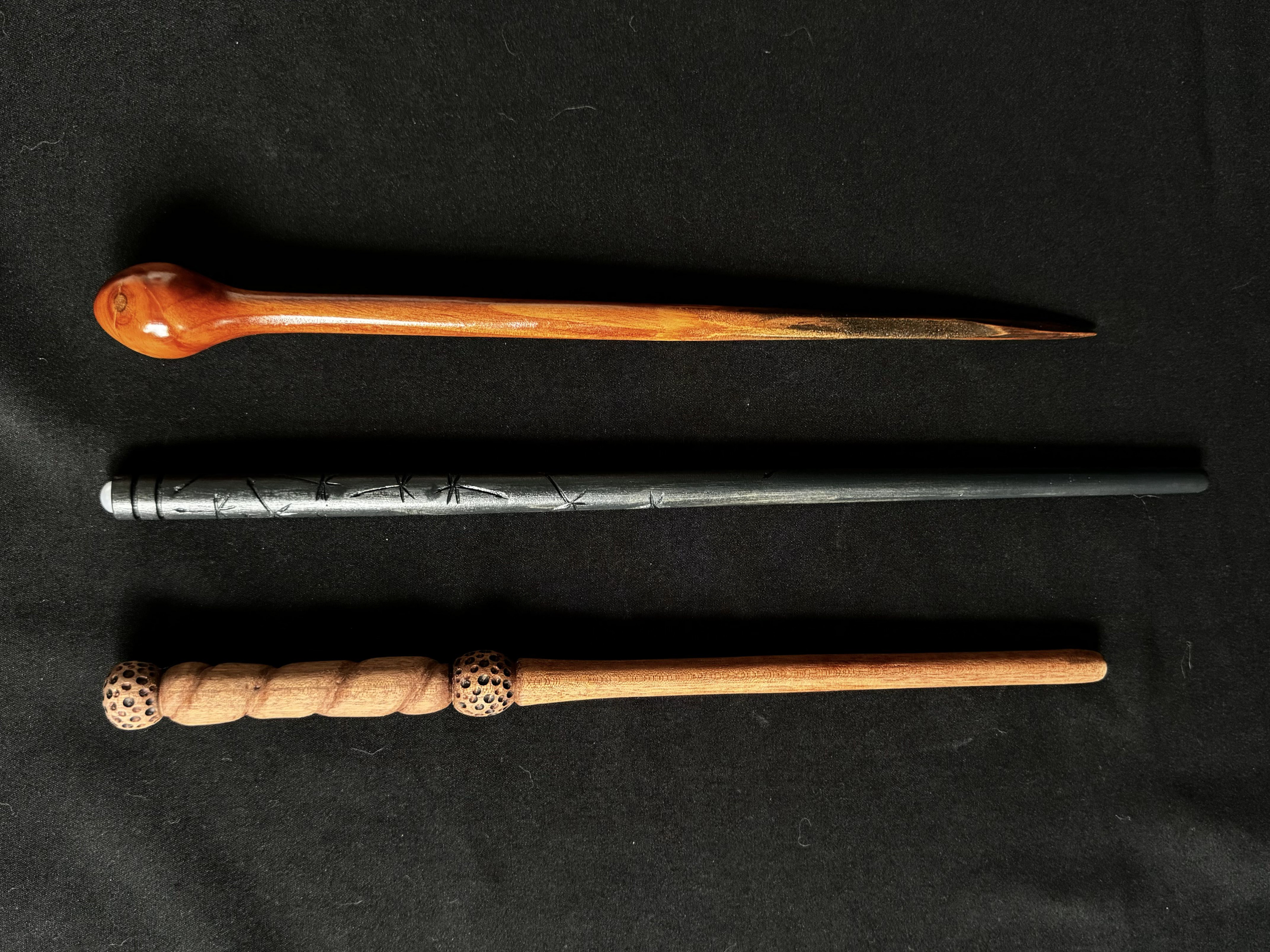 Various magic wands made as commissions or gifts. Combination of hand carving and lathed, paint and varnish. Fir, hazel, and sapele.
