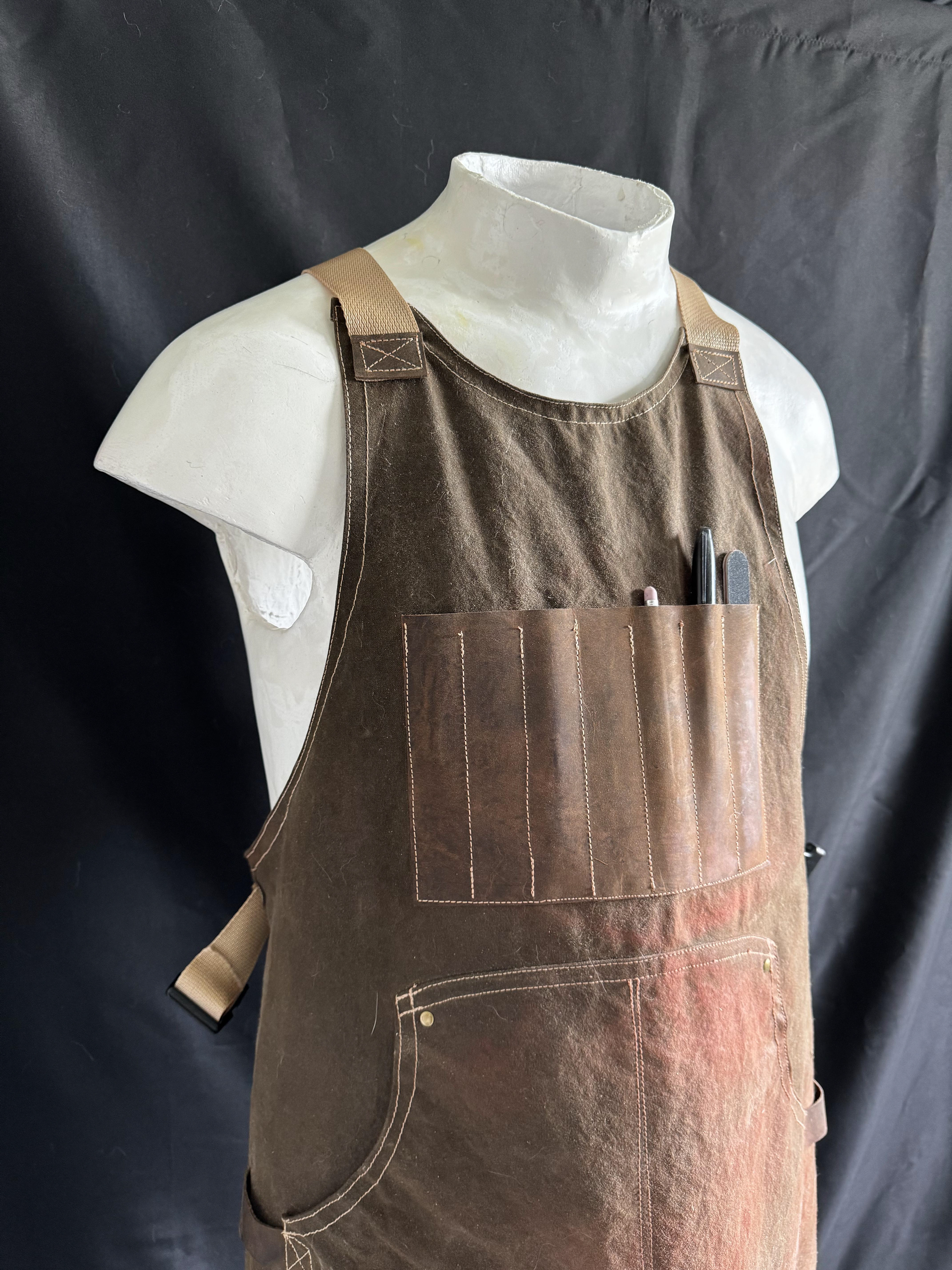 My first sewing project. Inspired by a project shared by Adam Savage, I wanted a comfortable workshop apron with lots of pockets. Waxed canvas, nylon webbing, leather. It's taken on some fun weathering after years of use.